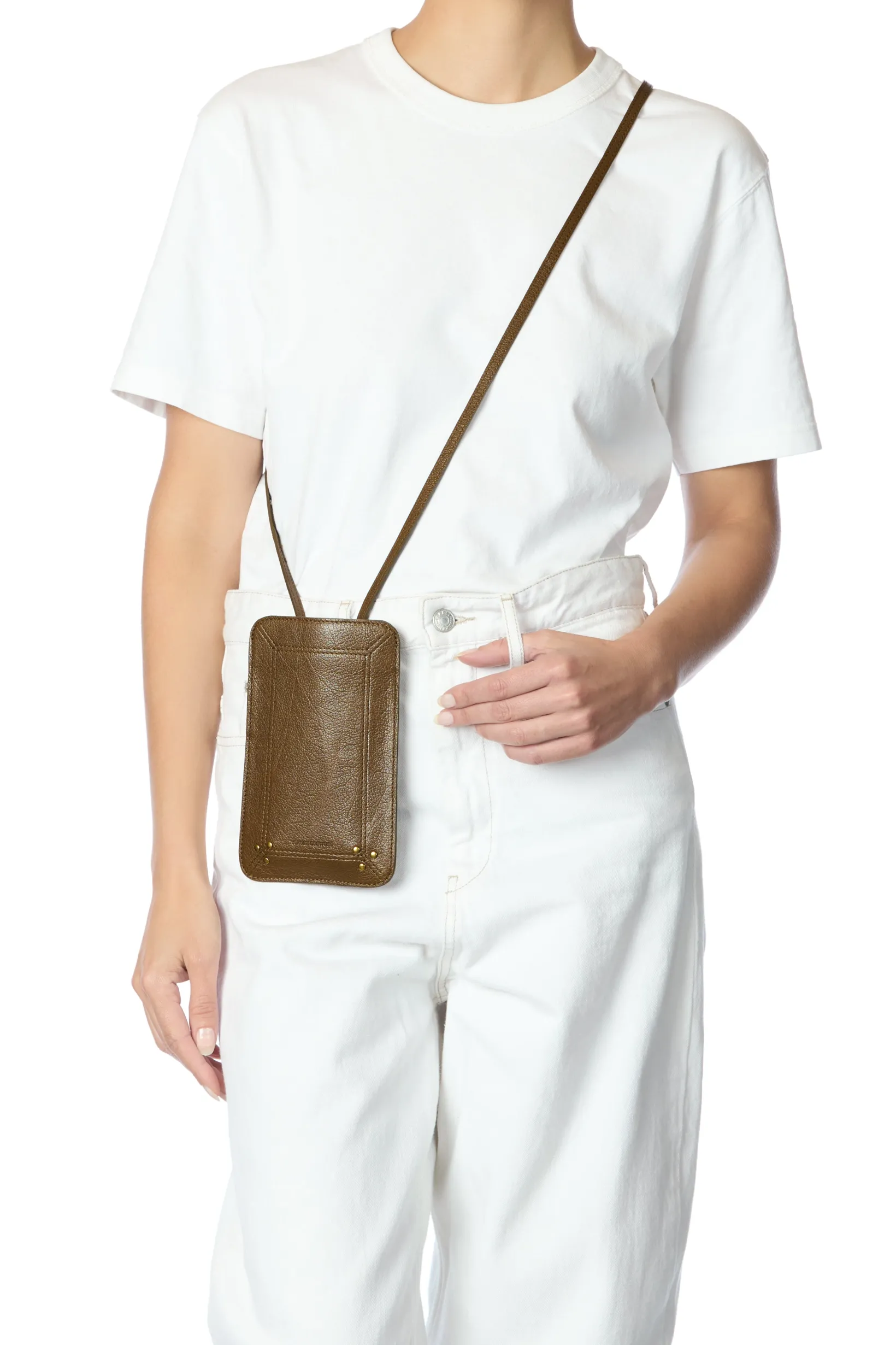 Phone case, worn cross-body. Leather shoulder strap. Expanded size to accommodate even more phone formats. Patch pocket on the back. Link length: 116 cm