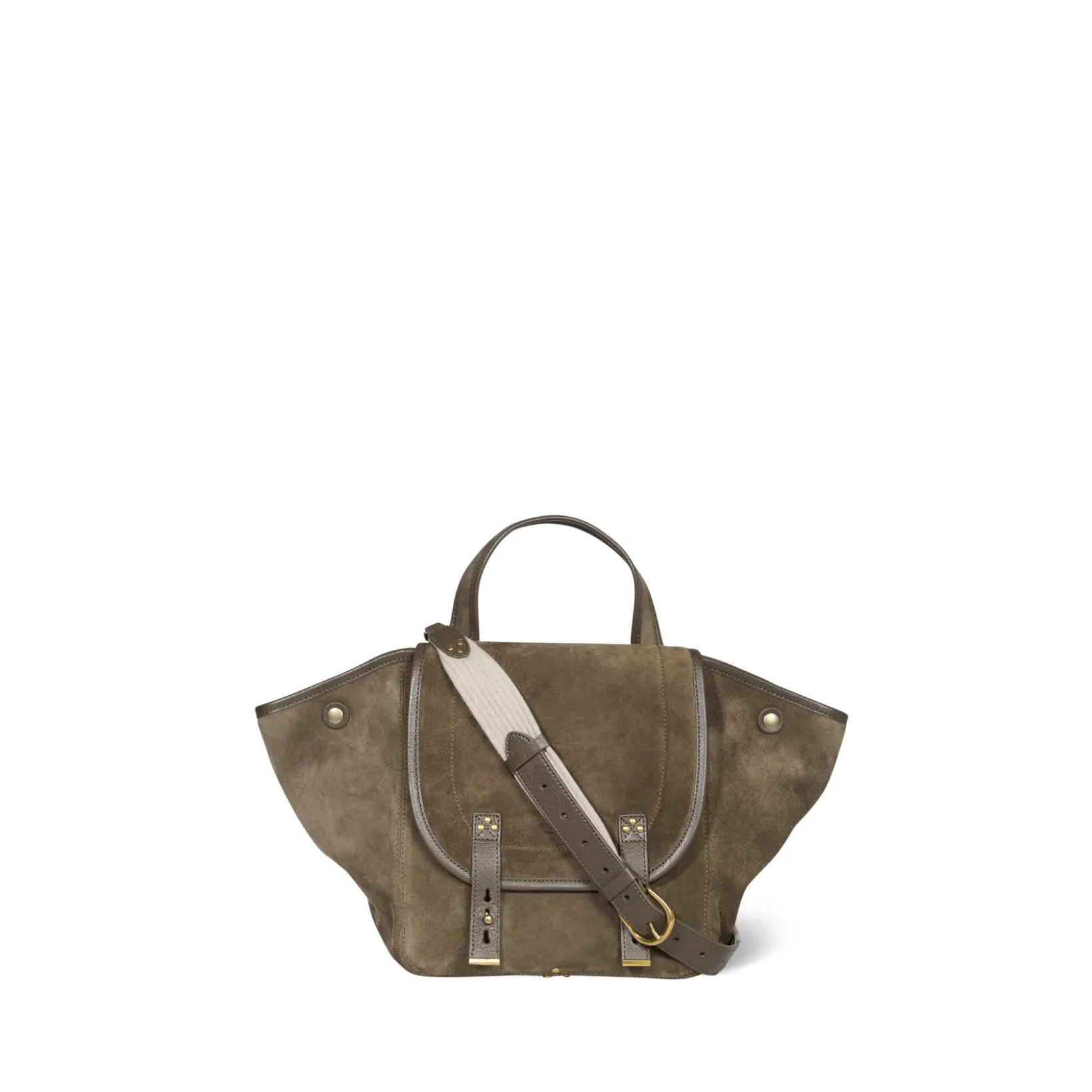 Basket-style tote bag, can be worn on the shoulder, across the chest or by hand. Adjustable, removable shoulder strap. Closing with a leather flap.