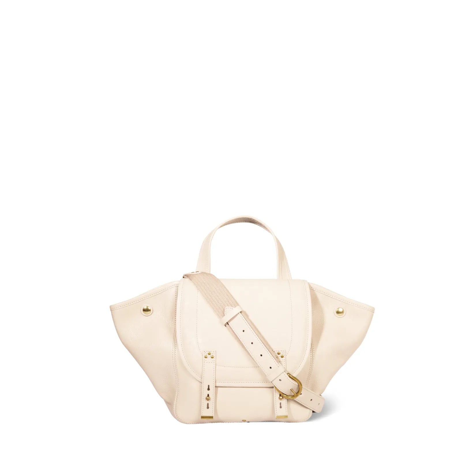 Basket-style tote bag, can be worn on the shoulder, across the chest or by hand. Adjustable, removable shoulder strap. Closing with a leather flap.