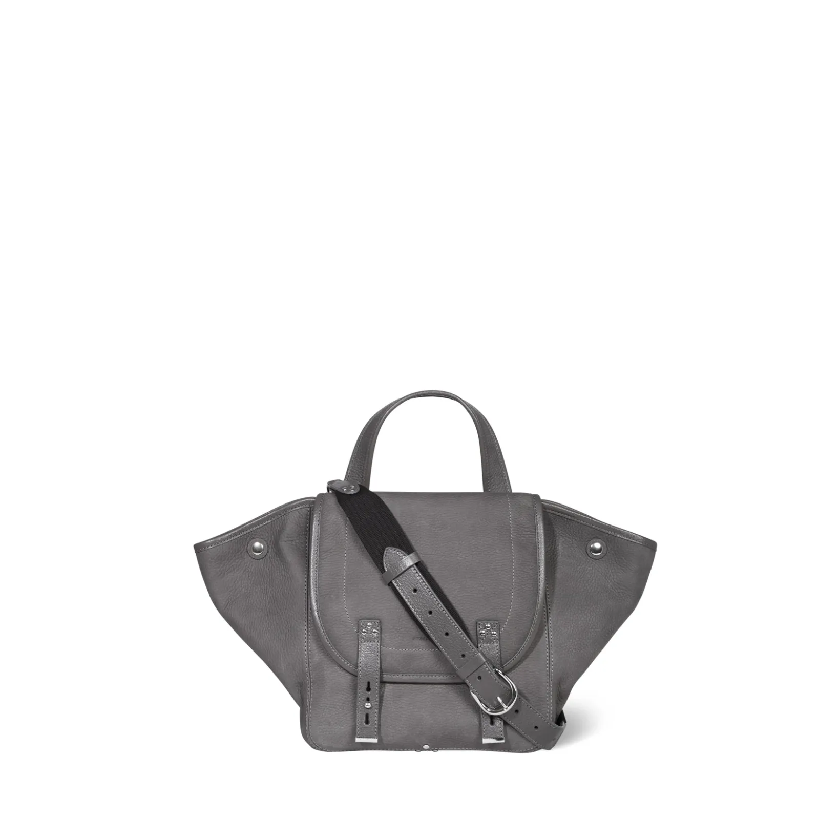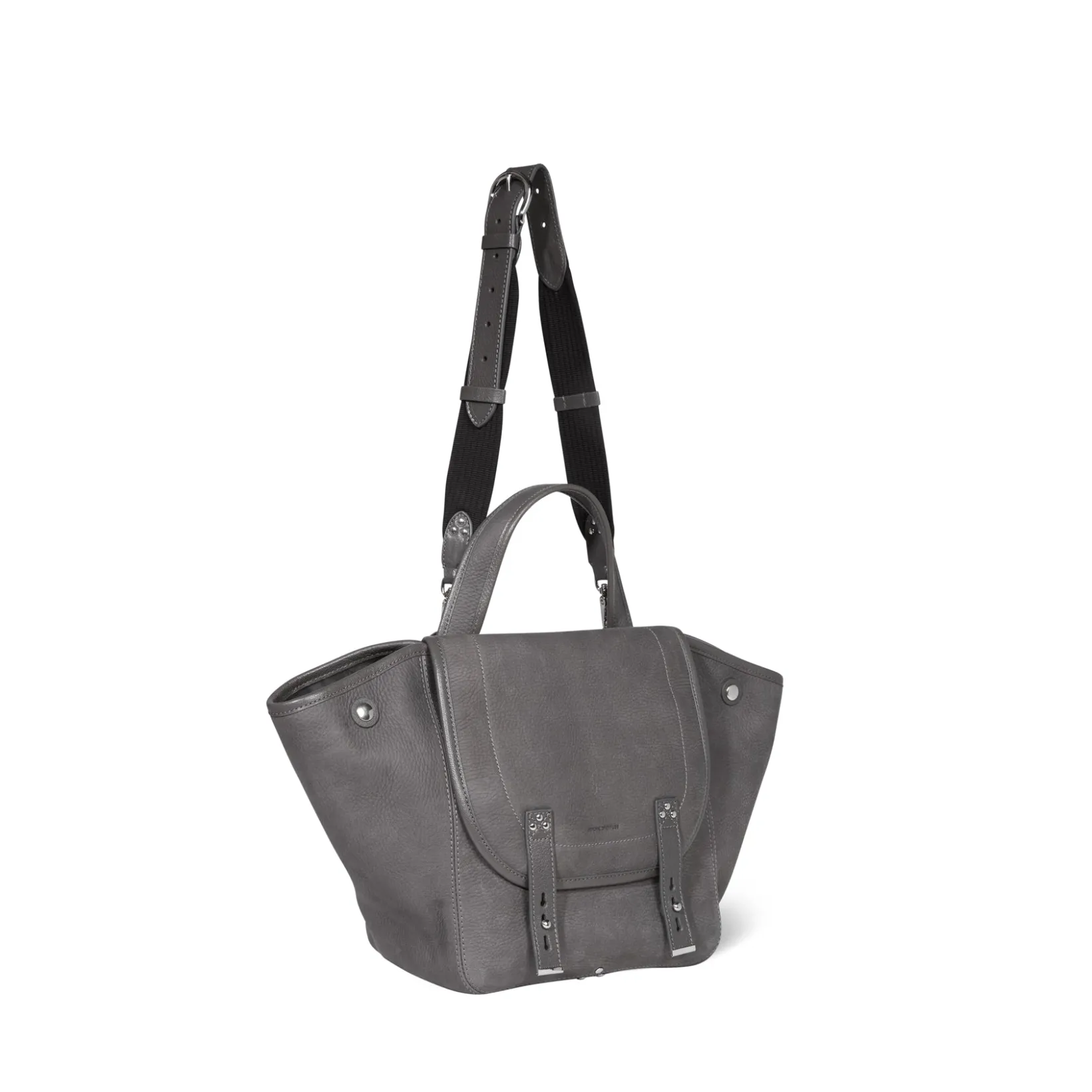 Basket-style tote bag, can be worn on the shoulder, across the chest or by hand. Adjustable, removable shoulder strap. Closing with a leather flap.